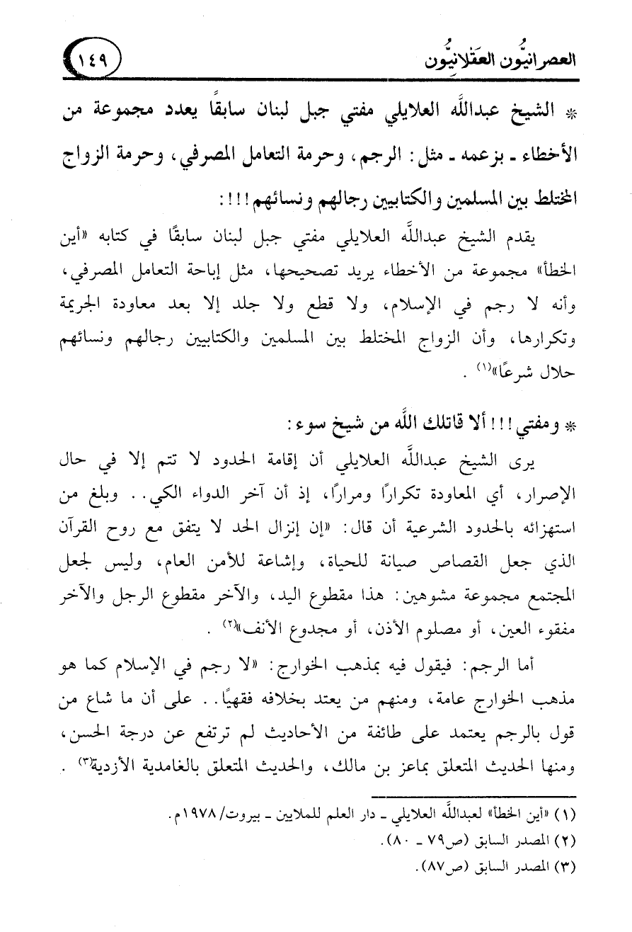 * الشيخ عبد الله العلايلي مفتي جبل لبنان سابقًا يعدد مجموعة من الأخطاء -بزعمه- مثل: الرجم، وحرمة التعامل المصرفي، وحرمة الزواج المختلط بين المسلمين والكتابيين رجالهم ونسائهم!!!: