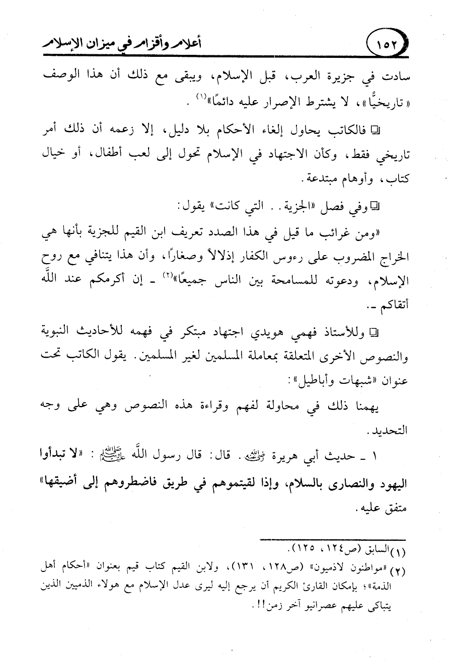 (2) "مواطنون لا ذميون" (ص 128، 131)، ولابن القيم كتاب قيم بعنوان "أحكام أهل الذمة"؛ بإمكان القارئ الكريم أن يرجع إليه ليرى عدل الإسلام مع هؤلاء الذميين الذين يتباكى عليهم عصرانيو آخر زمن!!.