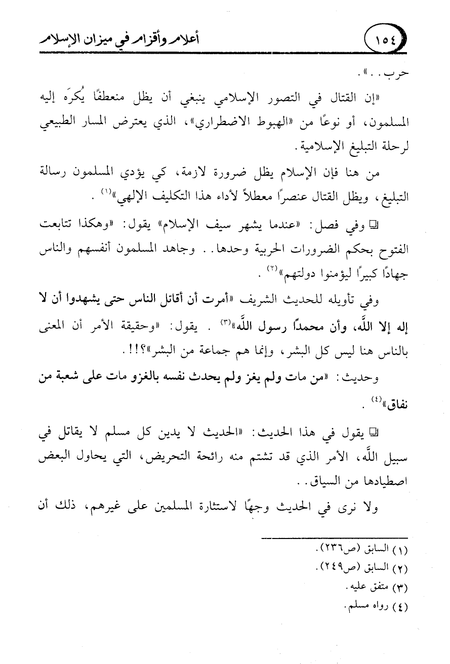 "إن القتال في التصور الإسلامي ينبغي أن يظل منعطفًا يُكرَه إليه المسلمون، أو نوعًا من "الهبوط الاضطراري"، الذي يعترض المسار الطبيعي لرحلة التبليغ الإسلامية.
