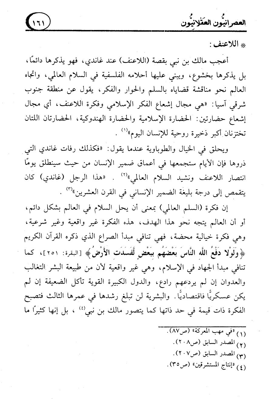 إن فكرة (السلم العالمي) بمعنى أن يحل السلام في العالم بشكل دائم، أو أن العالم يتجه نحو هذا الهدف، هذه الفكرة غير واقعية وغير شرعية، وهي فكرة خيالية محضة، فهي تنافي مبدأ الصراع الذي ذكره القرآن الكريم {وَلَوْلَا دَفْعُ اللهِ النَّاسَ بَعْضَهُمْ بِبَعْضٍ لَفَسَدَتِ الْأَرْضُ} [البقرة: 251]، كما تنافي مبدأ الجهاد في الإسلام، وهي غير واقعية لأن من طبيعة البشر التغالب والعدوان إن لم يردعهم رادع، والدول الكبيرة القوية تأكل الضعيفة إن لم يكن عسكريًّا فاقتصاديًّا. والبشرية لن تبلغ رشدها في عمرها الثالث فتصبح الفكرة ذات قيمة في حد ذاتها كما يتصور مالك بن نبي (4)، بل إنها كثيرًا ما