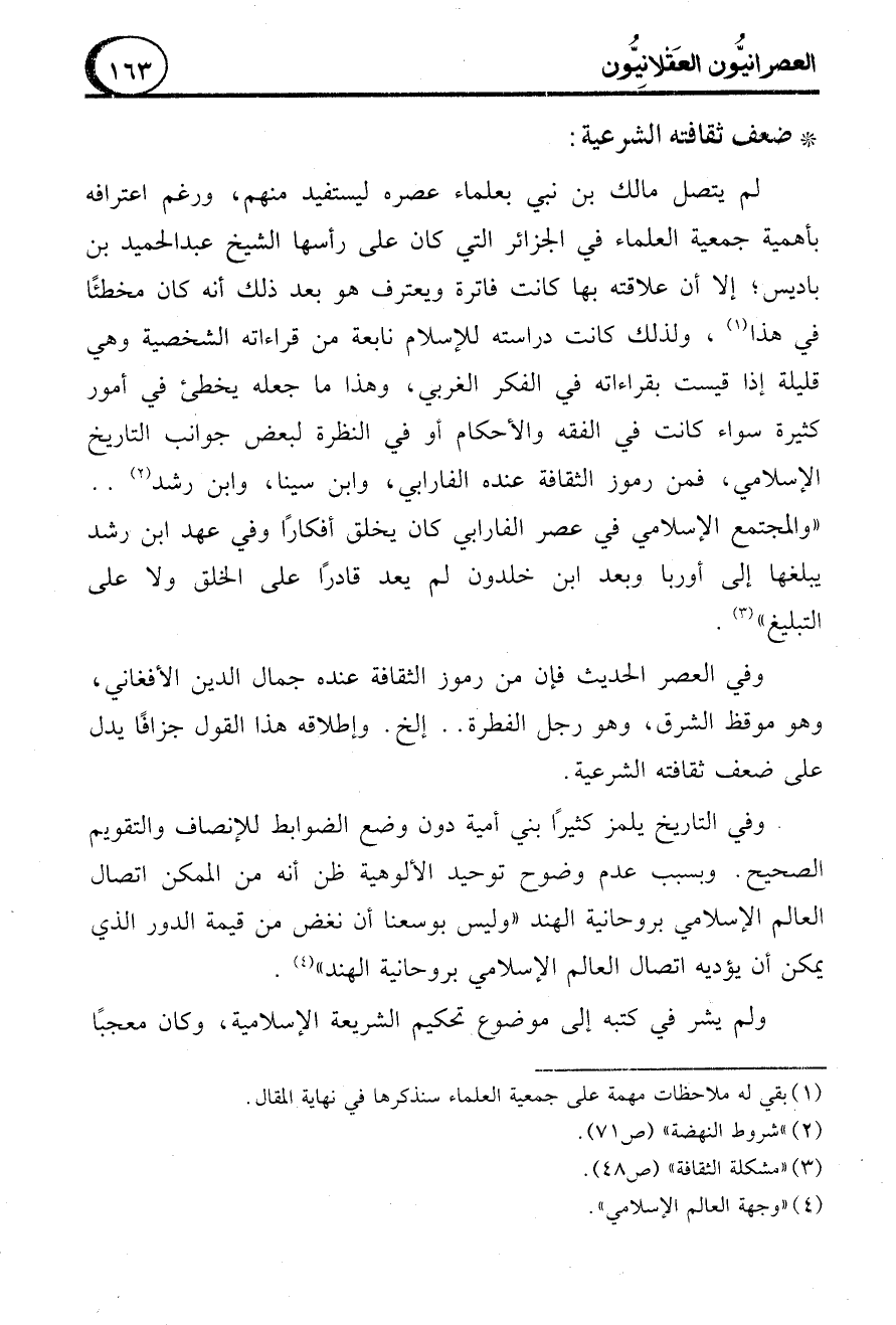 لم يتصل مالك بن نبي بعلماء عصره ليستفيد منهم، ورغم اعترافه بأهمية جمعية العلماء في الجزائر التي كان على رأسها الشيخ عبد الحميد بن باديس؛ إلا أن علاقته بها كانت فاترة ويعترف هو بعد ذلك أنه كان مخطئًا في هذا (1)، ولذلك كانت دراسته للإسلام نابعة من قراءاته الشخصية وهي قليلة إذا قيست بقراءاته في الفكر الغربي، وهذا ما جعله يخطئ في أمور كثيرة سواء كانت في الفقه والأحكام أو في النظرة لبعض جوانب التاريخ الإسلامي، فمن رموز الثقافة عنده الفارابي، وابن سينا، وابن رشد (2) ..