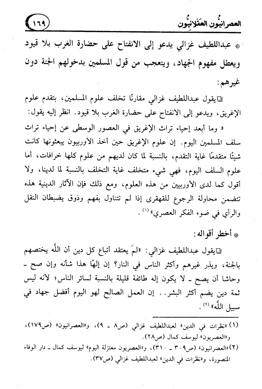(1) "نظرات في الدين" لعبد اللطيف غزالي (ص 8 - 9)، و"العصرانيون" (ص 179)، و"العصريون" ليوسف كمال (ص 28).