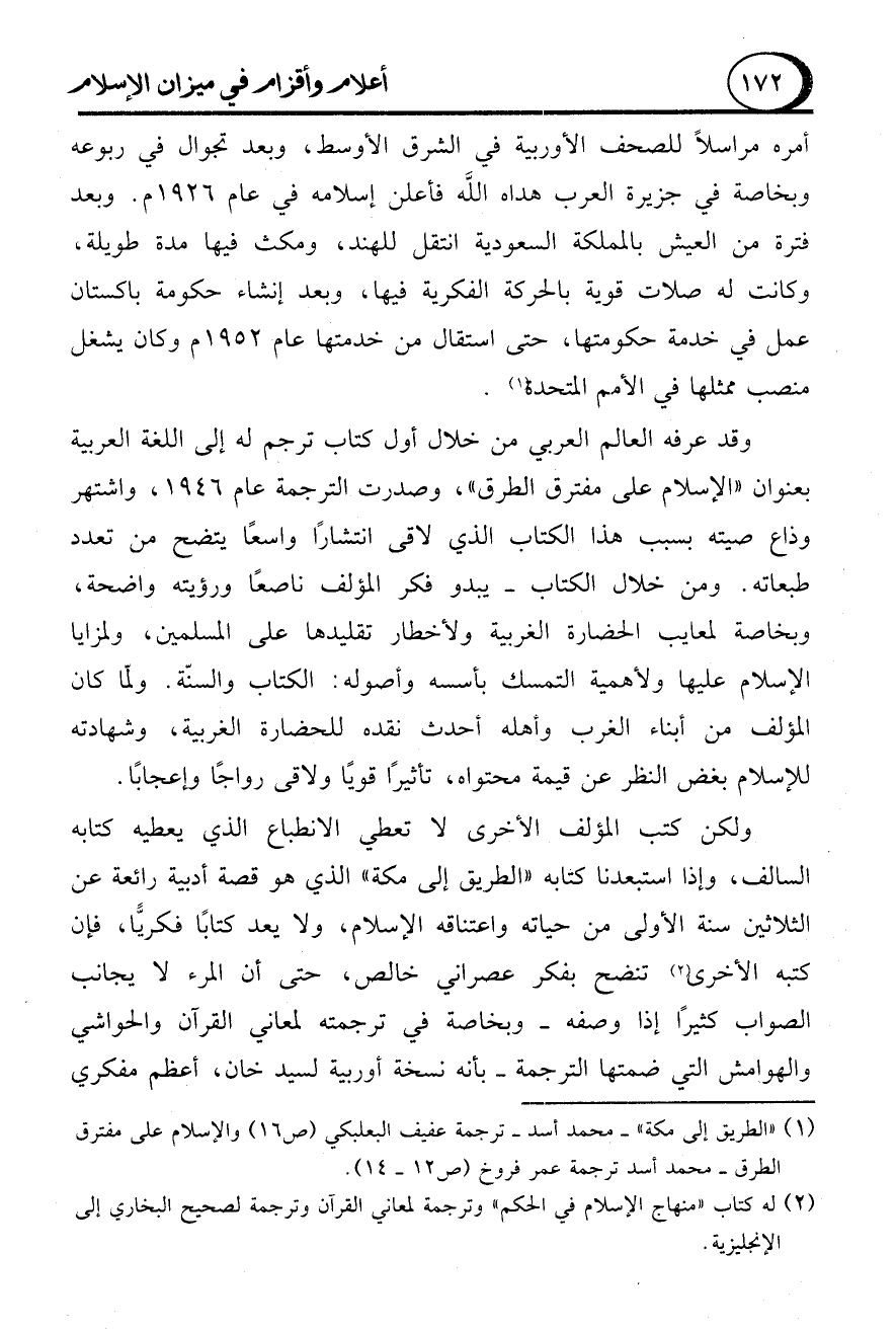 (1) "الطريق إلى مكة" - محمد أسد - ترجمة عفيف البعلبكي (ص 16) والإسلام على مفترق الطرق - محمد أسد ترجمة عمر فروخ (ص 12 - 14).