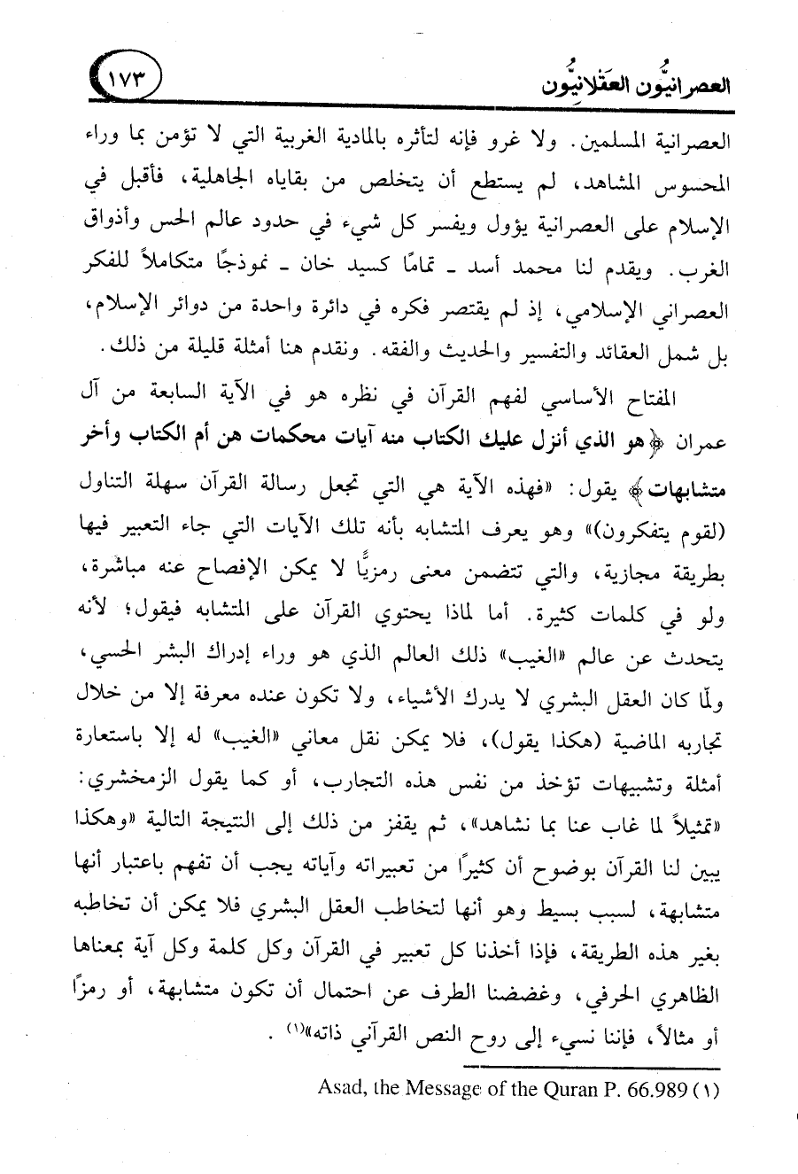 العصرانية المسلمين. ولا غرو فإنه لتأثره بالمادية الغربية التي لا تؤمن بما وراء المحسوس المشاهد، لم يستطع أن يتخلص من بقاياه الجاهلية، فأقبل في الإسلام على العصرانية يؤول ويفسر كل شيء في حدود عالم الحس وأذواق الغرب. ويقدم لنا محمد أسد -تمامًا كسيد خان- نموذجًا متكاملاً للفكر العصراني الإسلامي، إذ لم يقتصر فكره في دائرة واحدة من دوائر الإسلام، بل شمل العقائد والتفسير والحديث والفقه. ونقدم هنا أمثلة قليلة من ذلك.