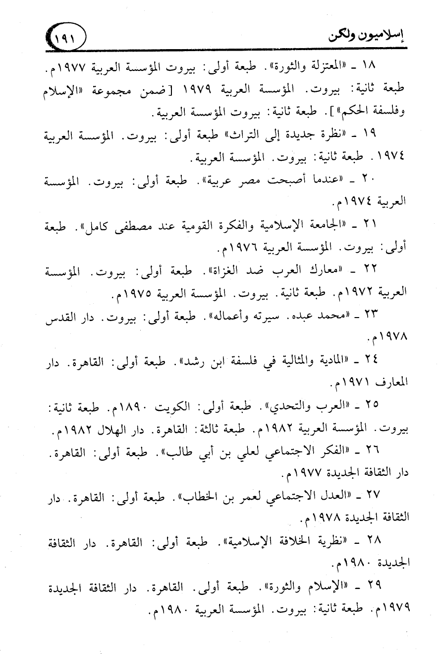 29 - "الإسلام والثورة". طبعة أولى. القاهرة. دار الثقافة الجديدة 1979 م. طبعة ثانية: بيروت. المؤسسة العربية 1980 م.