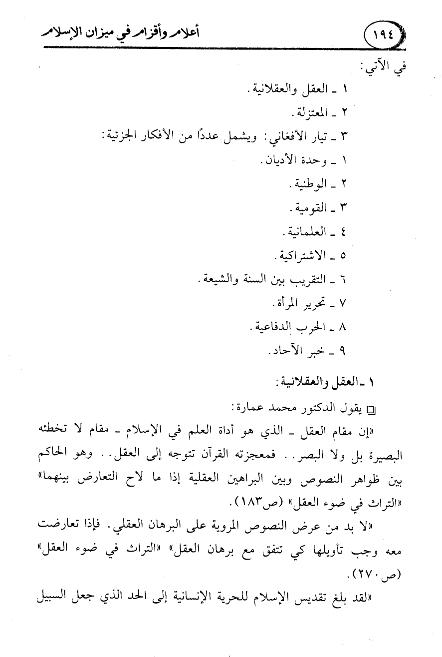 "إن مقام العقل -الذي هو أداة العلم في الإسلام- مقام لا تخطئه البصيرة بل ولا البصر .. فمعجزته القرآن تتوجه إلى العقل .. وهو الحاكم بين ظواهر النصوص وبين البراهين العقلية إذا ما لاح التعارض بينهما" "التراث في ضوء العقل" (ص 183).