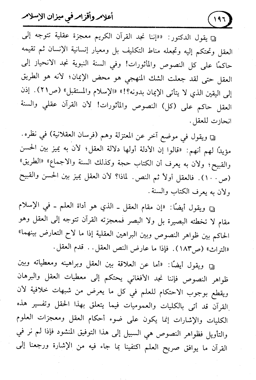 - ويقول أيضًا: "إن مقام العقل -الذي هو أداة العلم- في الإسلام مقام لا تخطئه البصيرة بل ولا البصر فمعجزته القرآن تتوجه إلى العقل وهو الحاكم بين ظواهر النصوص وبين البراهين العقلية إذا ما لاح التعارض بينهما" "التراث" (ص 183). فإذا ما عارض النص العقل .. قدم العقل.