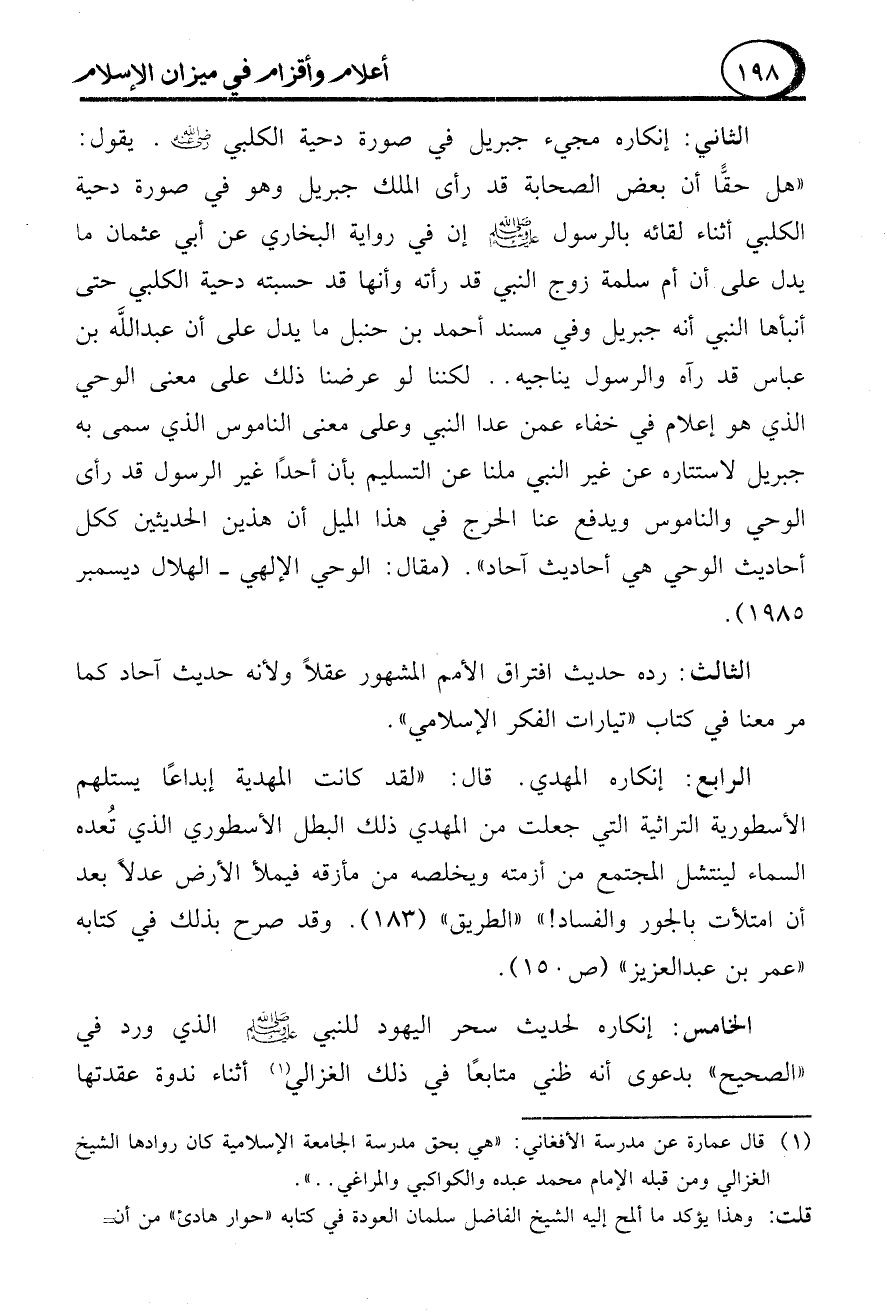 (1) قال عمارة عن مدرسة الأفغاني: "هي بحق مدرسة الجامعة الإسلامية كان روادها الشيخ الغزالي ومن قبله الإمام محمد عبده والكواكبي والمراغي .. ".