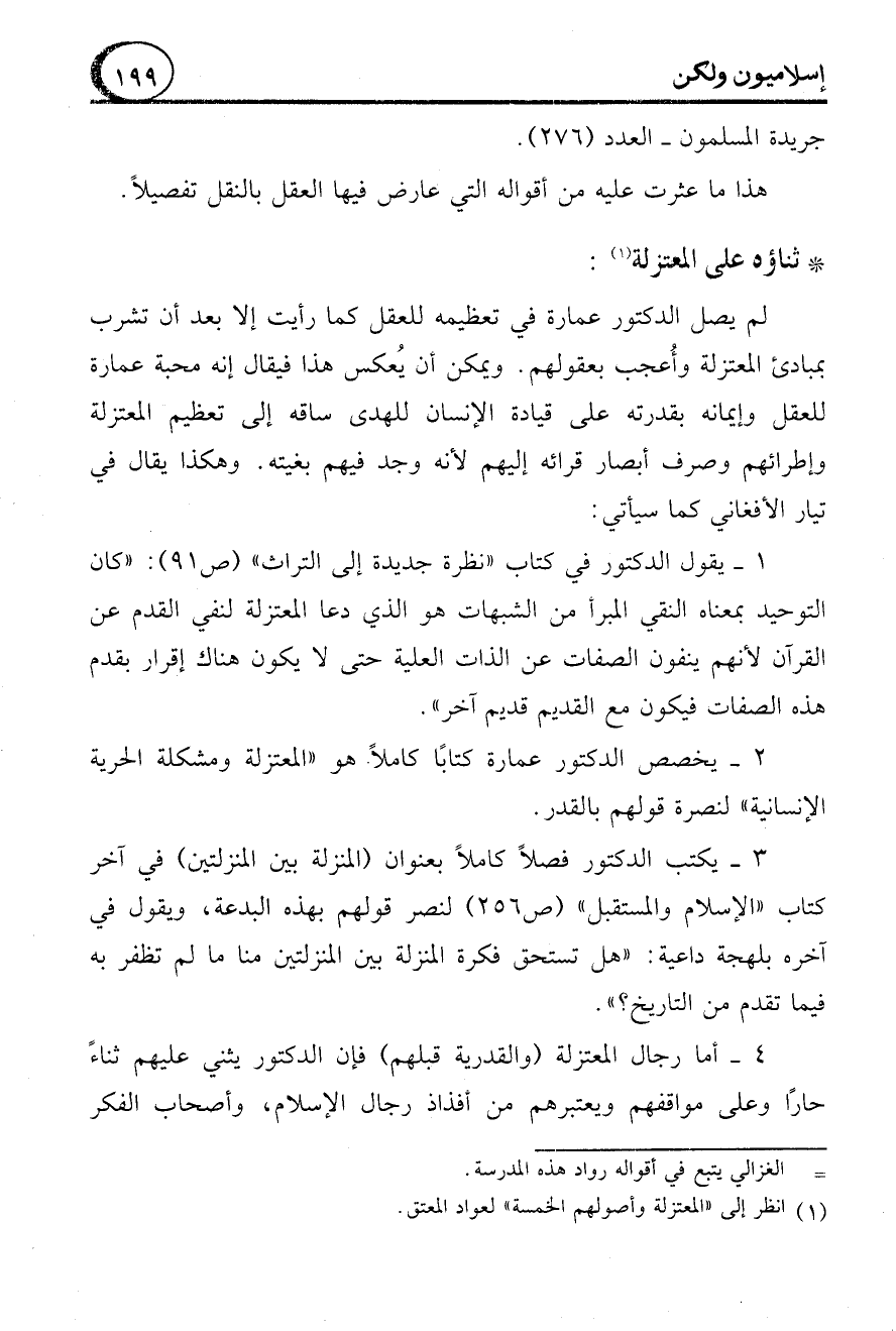 4 - أما رجال المعتزلة (والقدرية قبلهم) فإن الدكتور يثني عليهم ثناءً حارًا وعلى مواقفهم ويعتبرهم من أفذاذ رجال الإسلام، وأصحاب الفكر