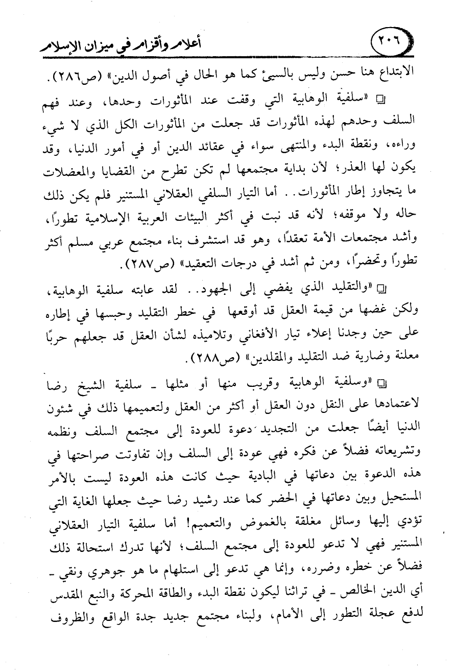 - "والتقليد الذي يفضي إلى الجهود .. لقد عابته سلفية الوهابية، ولكن غضها من قيمة العقل قد أوقعها في خطر التقليد وحبسها في إطاره على حين وجدنا إعلاء تيار الأفغاني وتلاميذه لشأن العقل قد جعلهم حربًا معلنة وضارية ضد التقليد والمقلدين" (ص 288).