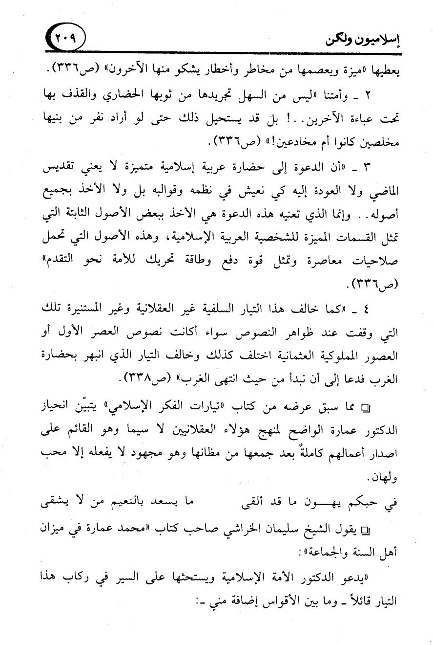 4 - "كما خالف هذا التيار السلفية غير العقلانية وغير المستنيرة تلك التي وقفت عند ظواهر النصوص سواء أكانت نصوص العصر الأول أو العصور المملوكية العثمانية اختلف كذلك وخالف التيار الذي انبهر بحضارة الغرب فدعا إلى أن نبدأ من حيث انتهى الغرب" (ص 338).