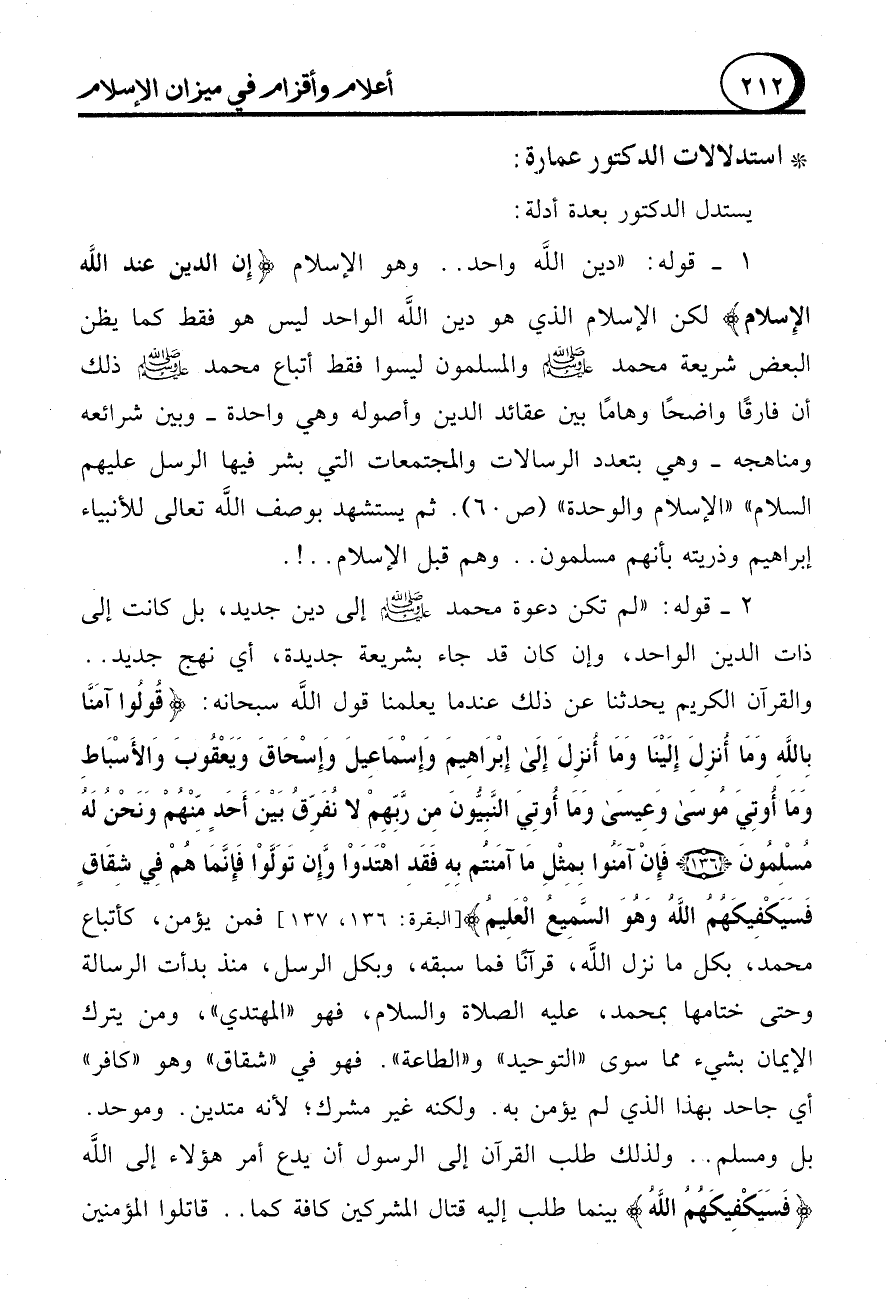 1 - قوله: "دين الله واحد .. وهو الإسلام {إِنَّ الدِّينَ عِنْدَ اللهِ الْإِسْلَامُ} لكن الإسلام الذي هو دين الله الواحد ليس هو فقط كما يظن البعض شريعة محمد - صلى الله عليه وسلم - والمسلمون ليسوا فقط أتباع محمد - صلى الله عليه وسلم - ذلك أن فارقًا واضحًا وهامًا بين عقائد الدين وأصوله وهي واحدة -وبين شرائعه ومناهجه- وهي بتعدد الرسالات والمجتمعات التي بشر فيها الرسل عليهم السلام" "الإسلام والوحدة" (ص 60). ثم يستشهد بوصف الله تعالى للأنبياء إبراهيم وذريته بأنهم مسلمون .. وهم قبل الإسلام .. !.
