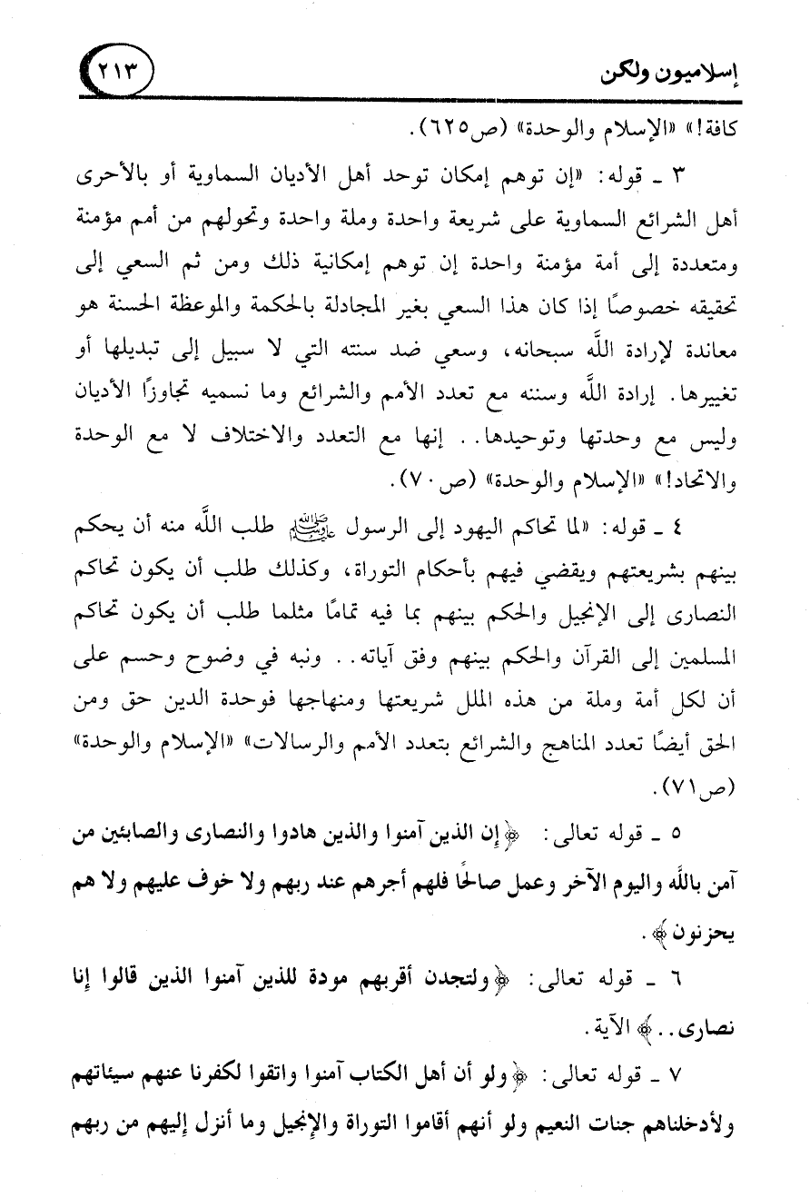 3 - قوله: "إن توهم إمكان توحد أهل الأديان السماوية أو بالأحرى أهل الشرائع السماوية على شريعة واحدة وملة واحدة وتحولهم من أمم مؤمنة ومتعددة إلى أمة مؤمنة واحدة إن توهم إمكانية ذلك ومن ثم السعي إلى تحقيقه خصوصًا إذا كان هذا السعي بغير المجادلة بالحكمة والموعظة الحسنة هو معاندة لإرادة الله سبحانه، وسعي ضد سنته التي لا سبيل إلى تبديلها أو تغييرها. إرادة الله وسننه مع تعدد الأمم والشرائع وما نسميه تجاوزًا الأديان وليس مع وحدتها وتوحيدها .. إنها مع التعدد والاختلاف لا مع الوحدة والاتحاد! " "الإسلام والوحدة" (ص 70).