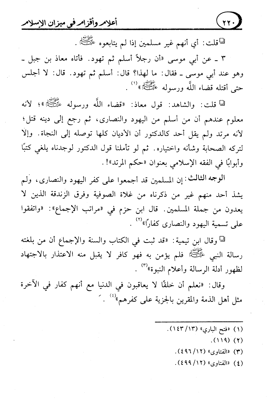 - قلت: والشاهد: قول معاذ: "قضاء الله ورسوله - صلى الله عليه وسلم -"؛ لأنه معلوم عندهم أن من أسلم من اليهود والنصارى، ثم رجع إلى دينه قتل؛ لأنه مرتد ولم يقل أحد كالدكتور أن الأديان كلها توصله إلى النجاة. وإلا لتركه الصحابة وشأنه واختياره. ثم لو تأملنا قول الدكتور لوجدناه يلغي كتبًا وأبوابًا في الفقه الإسلامي بعنوان "حكم المرتد"!.