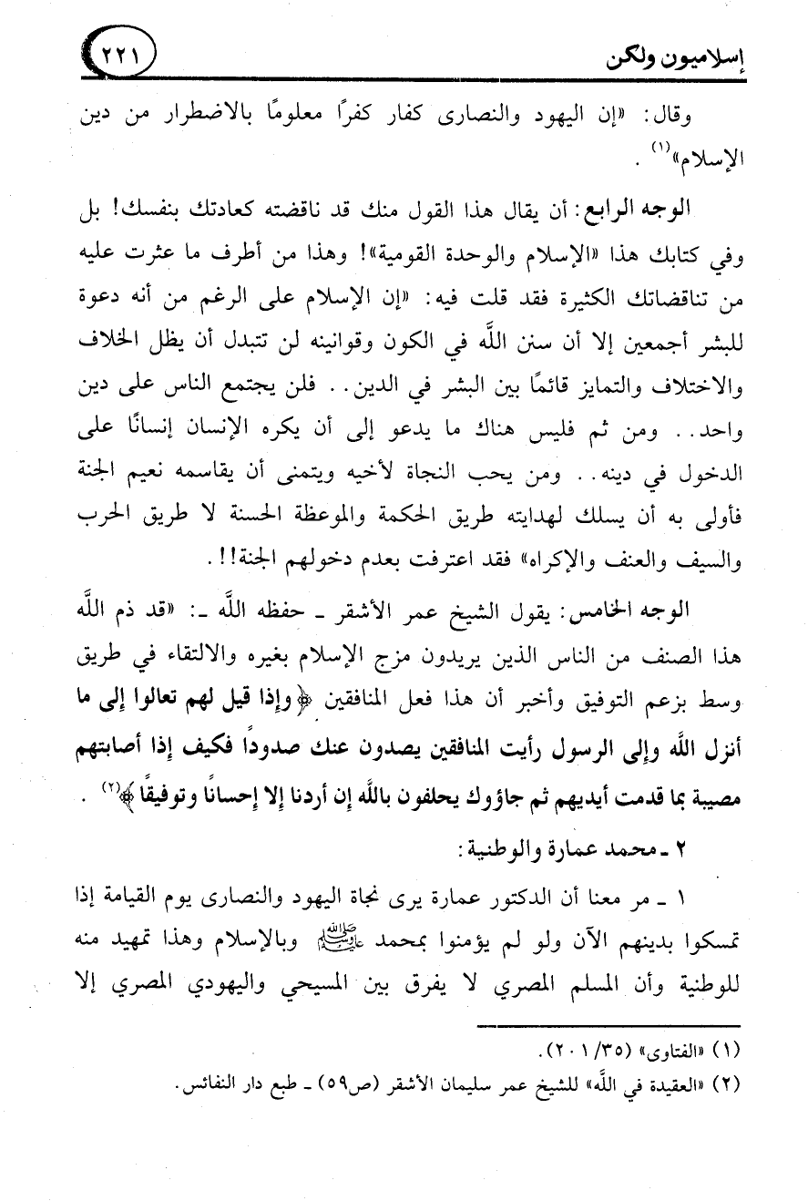 الوجه الرابع: أن يقال هذا القول منك قد ناقضته كعادتك بنفسك! بل وفي كتابك هذا "الإسلام والوحدة القومية"! وهذا من أطرف ما عثرت عليه من تناقضاتك الكثيرة فقد قلت فيه: "إن الإسلام على الرغم من أنه دعوة للبشر أجمعين إلا أن سنن الله في الكون وقوانينه لن تتبدل أن يظل الخلاف والاختلاف والتمايز قائمًا بين البشر في الدين .. فلن يجتمع الناس على دين واحد .. ومن ثم فليس هناك ما يدعو إلى أن يكره الإنسان إنسانًا على الدخول في دينه .. ومن يحب النجاة لأخيه ويتمنى أن يقاسمه نعيم الجنة فأولى به أن يسلك لهدايته طريق الحكمة والموعظة الحسنة لا طريق الحرب والسيف والعنف والإكراه" فقد اعترفت بعدم دخولهم الجنة!!.