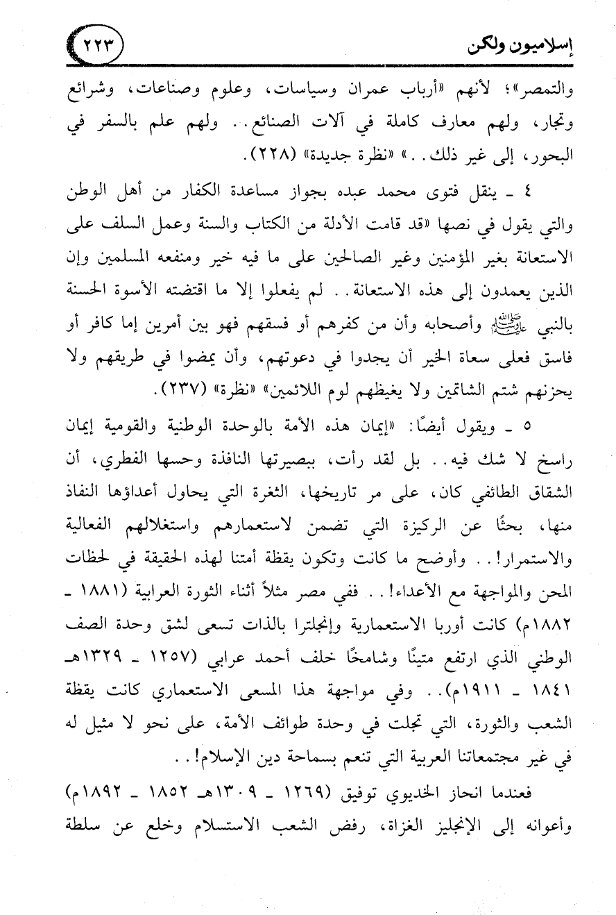 4 - ينقل فتوى محمد عبده بجواز مساعدة الكفار من أهل الوطن والتي يقول في نصها "قد قامت الأدلة من الكتاب والسنة وعمل السلف على الاستعانة بغير المؤمنين وغير الصالحين على ما فيه خير ومنفعه المسلمين وإن الذين يعمدون إلى هذه الاستعانة .. لم يفعلوا إلا ما اقتضته الأسوة الحسنة بالنبي - صلى الله عليه وسلم - وأصحابه وأن من كفرهم أو فسقهم فهو بين أمرين إما كافر أو فاسق فعلى سعاة الخير أن يجدوا في دعوتهم، وأن يمضوا في طريقهم ولا يحزنهم شتم الشاتمين ولا يغيظهم لوم اللائمين" "نظرة" (237).