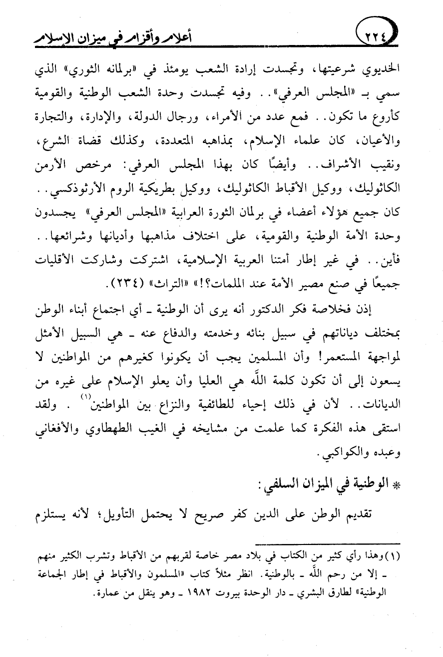 (1) وهذا رأي كثير من الكتاب في بلاد مصر خاصة لقربهم من الأقباط وتشرب الكثير منهم -إلا من رحم الله- بالوطنية. انظر مثلاً كتاب "المسلمون والأقباط في إطار الجماعة الوطنية" لطارق البشري - دار الوحدة بيروت 1982 - وهو ينقل من عمارة.