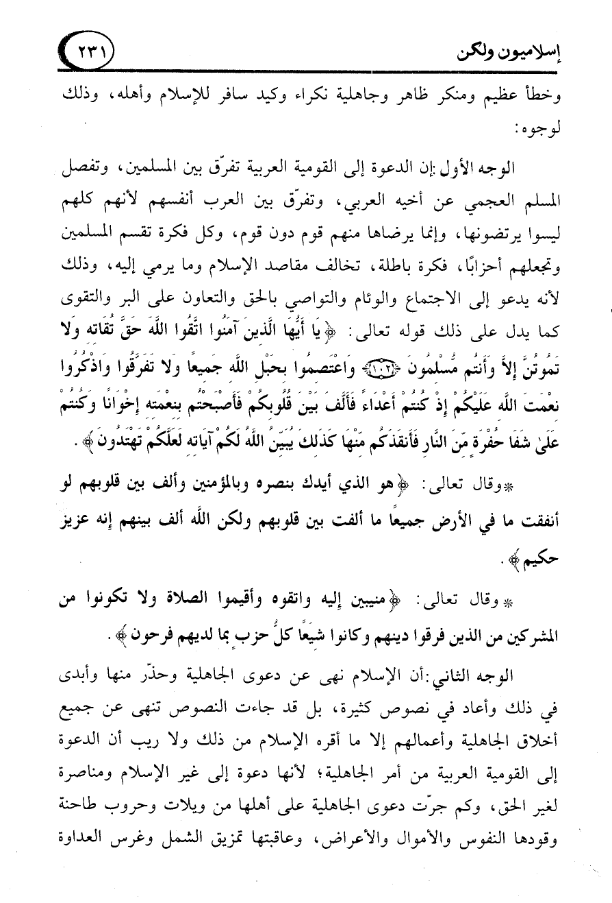 الوجه الأول: إن الدعوة إلى القومية العربية تفرّق بين المسلمين، وتفصل المسلم العجمي عن أخيه العربي، وتفرّق بين العرب أنفسهم لأنهم كلهم ليسوا يرتضونها، وإنما يرضاها منهم قوم دون قوم، وكل فكرة تقسم المسلمين وتجعلهم أحزابًا، فكرة باطلة، تخالف مقاصد الإسلام وما يرمي إليه، وذلك لأنه يدعو إلى الاجتماع والوئام والتواصي بالحق والتعاون على البر والتقوي كما يدل على ذلك قوله تعالى: {يَا أَيُّهَا الَّذِينَ آَمَنُوا اتَّقُوا اللهَ حَقَّ تُقَاتِهِ وَلَا تَمُوتُنَّ إِلَّا وَأَنْتُمْ مُسْلِمُونَ (102) وَاعْتَصِمُوا بِحَبْلِ اللهِ جَمِيعًا وَلَا تَفَرَّقُوا وَاذْكُرُوا نِعْمَةَ اللهِ عَلَيْكُمْ إِذْ كُنْتُمْ أَعْدَاءً فَأَلَّفَ بَيْنَ قُلُوبِكُمْ فَأَصْبَحْتُمْ بِنِعْمَتِهِ إِخْوَانًا وَكُنْتُمْ عَلَى شَفَا حُفْرَةٍ مِنَ النَّارِ فَأَنْقَذَكُمْ مِنْهَا كَذَلِكَ يُبَيِّنُ اللهُ لَكُمْ آَيَاتِهِ لَعَلَّكُمْ تَهْتَدُونَ}.