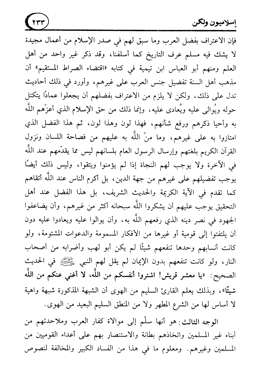 فإن الاعتراف بفضل العرب وما سبق لهم في صدر الإسلام من أعمال مجيدة لا يشك فيه مسلم عرف التاريخ كما أسلفنا، وقد ذكر غير واحد من أهل العلم ومنهم أبو العباس ابن تيمية في كتابه "اقتضاء الصراط المستقيم" أن مذهب أهل السنة تفضيل جنس العرب على غيرهم، وأورد في ذلك أحاديث تدل على ذلك، ولكن لا يلزم من الاعتراف بفضلهم أن يجعلوا عمادًا يتكتل حوله ويُوالى عليه ويُعادى عليه، وإنما ذلك من حق الإسلام الذي أعزّهم الله به وأحيا ذكرهم ورفع شأنهم، فهذا لون وهذا لون، ثم هذا الفضل الذي امتازوا به على غيرهم، وما منّ الله به عليهم من فصاحة اللسان ونزول القرآن الكريم بلغتهم وإرسال الرسول العام بلسانهم ليس مما يقدّمهم عند الله في الآخرة ولا يوجب لهم النجاة إذا لم يؤمنوا ويتقوا، وليس ذلك أيضًا يوجب تفضيلهم على غيرهم من جهة الدين، بل أكرم الناس عند الله أتقاهم كما تقدم في الآية الكريمة والحديث الشريف، بل هذا الفضل عند أهل التحقيق يوجب عليهم أن يشكروا الله سبحانه أكثر من غيرهم، وأن يضاعفوا الجهود في نصر دينه الذي رفعهم الله به، وأن يوالوا عليه ويعادوا عليه دون أن يلتفتوا إلى قومية أو غيرها من الأفكار المسمومة والدعوات المشئومة، ولو كانت أنسابهم وحدها تنفعهم شيئًا لم يكن أبو لهب وأضرابه من أصحاب النار، ولو كانت تنفعهم بدون الإيمان لم يقل لهم النبي - صلى الله عليه وسلم - في الحديث الصحيح: "يا معشر قريش! اشتروا أنفسكم من الله، لا أغني عنكم من الله شيئًا"، وبذلك يعلم القارئ السليم من الهوى أن الشبهة المذكورة شبهة واهية لا أساس لها من الشرع المطهر ولا من المنطق السليم البعيد من الهوى.