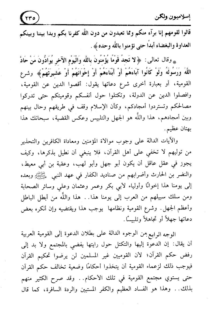 * وقال تعالى: {لَا تَجِدُ قَوْمًا يُؤْمِنُونَ بِاللهِ وَالْيَوْمِ الْآَخِرِ يُوَادُّونَ مَنْ حَادَّ اللهَ وَرَسُولَهُ وَلَوْ كَانُوا آَبَاءَهُمْ أَوْ أَبْنَاءَهُمْ أَوْ إِخْوَانَهُمْ أَوْ عَشِيرَتَهُمْ} وشرع القومية، أو بعبارة أخرى شرع دعاتها يقول: أقصوا الدين عن القومية، وافصلوا الدين عن الدولة، وتكتلوا حول أنفسكم وقوميتكم حتى تدركوا مصالحكم وتستردوا أمجادكم، وكأن الإسلام وقف في طريقهم وحال بينهم وبين أمجادهم، هذا والله هو الجهل والتلبيس وعكس القضية، سبحانك هذا بهتان عظيم.