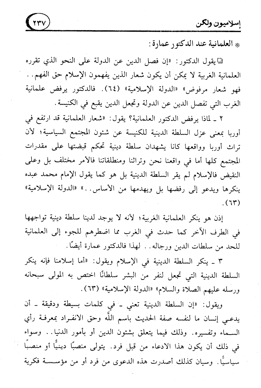 2 - لماذا يرفض الدكتور العلمانية؟ يقول: "شعار العلمانية قد ارتفع في أوربا بمعنى عزل السلطة الدينية للكنيسة عن شئون المجتمع السياسية؛ لأن تراث أوربا وواقعها كانا يشهدان سلطة دينية تحكم قبضتها على مقدرات المجتمع كلها أما في واقعنا نحن وتراثنا ومنطلقاتنا فالأمر مختلف بل وعلى النقيض فالإسلام لم يقر السلطة الدينية بل هو كما يقول الإمام محمد عبده ينكرها ويدعو إلى رفضها بل ويهدمها من الأساس .. " "الدولة الإسلامية" (63).