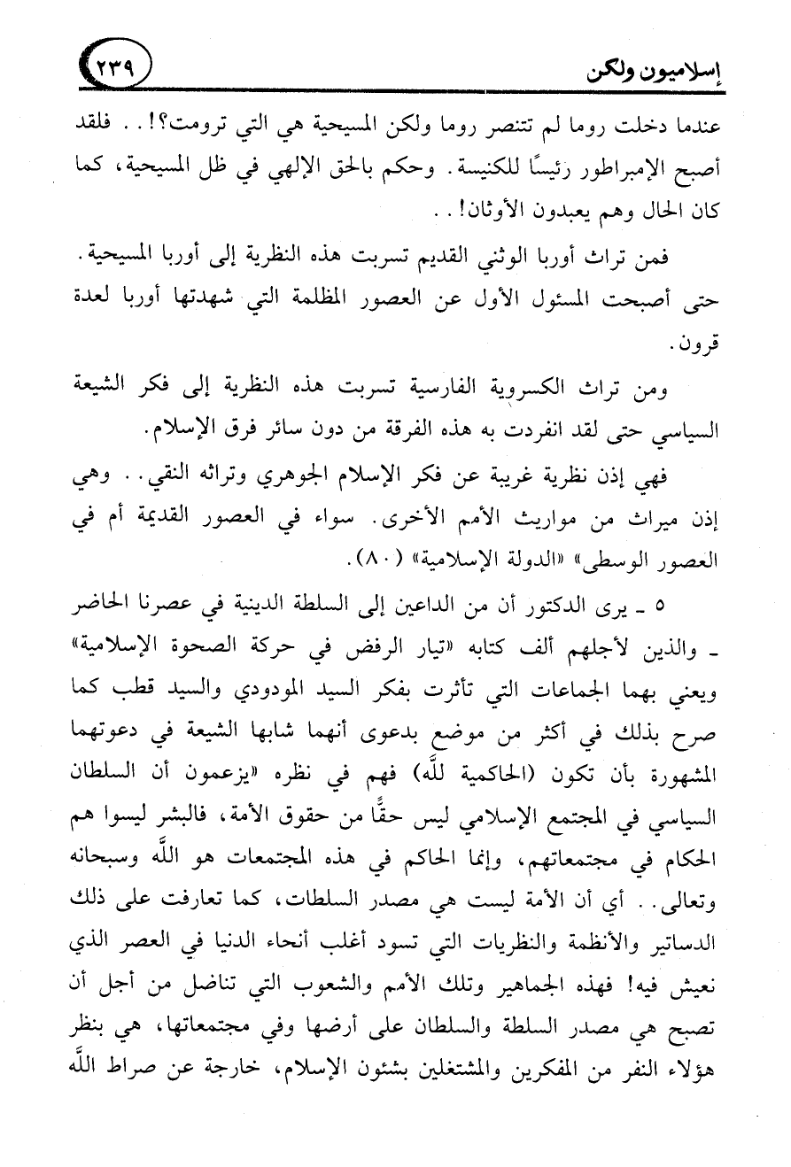5 - يرى الدكتور أن من الداعين إلى السلطة الدينية في عصرنا الحاضر - والذين لأجلهم ألف كتابه "تيار الرفض في حركة الصحوة الإسلامية" ويعني بهما الجماعات التي تأثرت بفكر السيد المودودي والسيد قطب كما صرح بذلك في أكثر من موضع بدعوى أنهما شابها الشيعة في دعوتهما المشهورة بأن تكون (الحاكمية لله) فهم في نظره "يزعمون أن السلطان السياسي في المجتمع الإسلامي ليس حقًّا من حقوق الأمة، فالبشر ليسوا هم الحكام في مجتمعاتهم، وإنما الحاكم في هذه المجتمعات هو الله وسبحانه وتعالى .. أي أن الأمة ليست هي مصدر السلطات، كما تعارفت على ذلك الدساتير والأنظمة والنظريات التي تسود أغلب أنحاء الدنيا في العصر الذي نعيش فيه! فهذه الجماهير وتلك الأمم والشعوب التي تناضل من أجل أن تصبح هي مصدر السلطة والسلطان على أرضها وفي مجتمعاتها، هي بنظر هؤلاء النفر من المفكرين والمشتغلين بشئون الإسلام، خارجة عن صراط الله