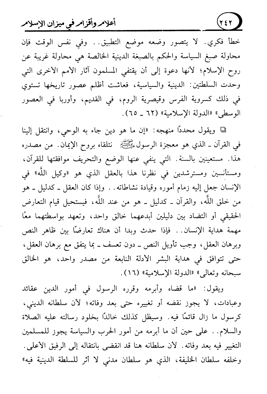 خطأ فكري. لا يتصور وضعه موضع التطبيق .. وفي نفس الوقت فإن محاولة صبغ السياسة والحكم بالصبغة الدينية الخالصة هي محاولة غريبة عن روح الإسلام؛ لأنها دعوة إلى أن يقتفي المسلمون أثار الأمم الأخرى التي وحدت السلطتين: الدينية والسياسية، فعاشت أظلم عصور تاريخها تستوي في ذلك كسروية الفرس وقيصرية الروم، في القديم، وأوربا في العصور الوسطى" "الدولة الإسلامية" (62 - 65).