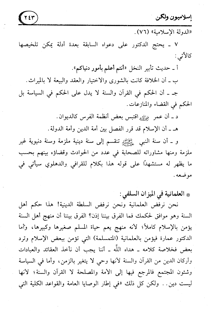 نحن نرفض العلمانية ونحن نرفض السلطة الدينية! هذا حكم أهل السنة وهو موافق لحكمك فما الفرق بيننا إذن؟ الفرق بيننا أن منهج أهل السنة يؤمن بالإسلام كاملاً، لأنه منهج يعم حياة المسلم صغيرها وكبيرها، وأما الدكتور عمارة فيؤمن بالعلمانية (المتمسلمة) التي تؤمن ببعض الإسلام وترد بعض فخلاصة كلامه -هداه الله- أننا يجب أن نأخذ العقائد والعبادات وأركان الدين من القرآن والسنة لأنها وحي لا يتغير بالزمن، وأما في السياسة وشئون المجتمع فالمرجع فيها إلى الأمة والمصلحة لا القرآن والسنة؛ لأنها ليست دين .. ولكن كل ذلك "في إطار الوصايا العامة والقواعد الكلية التي