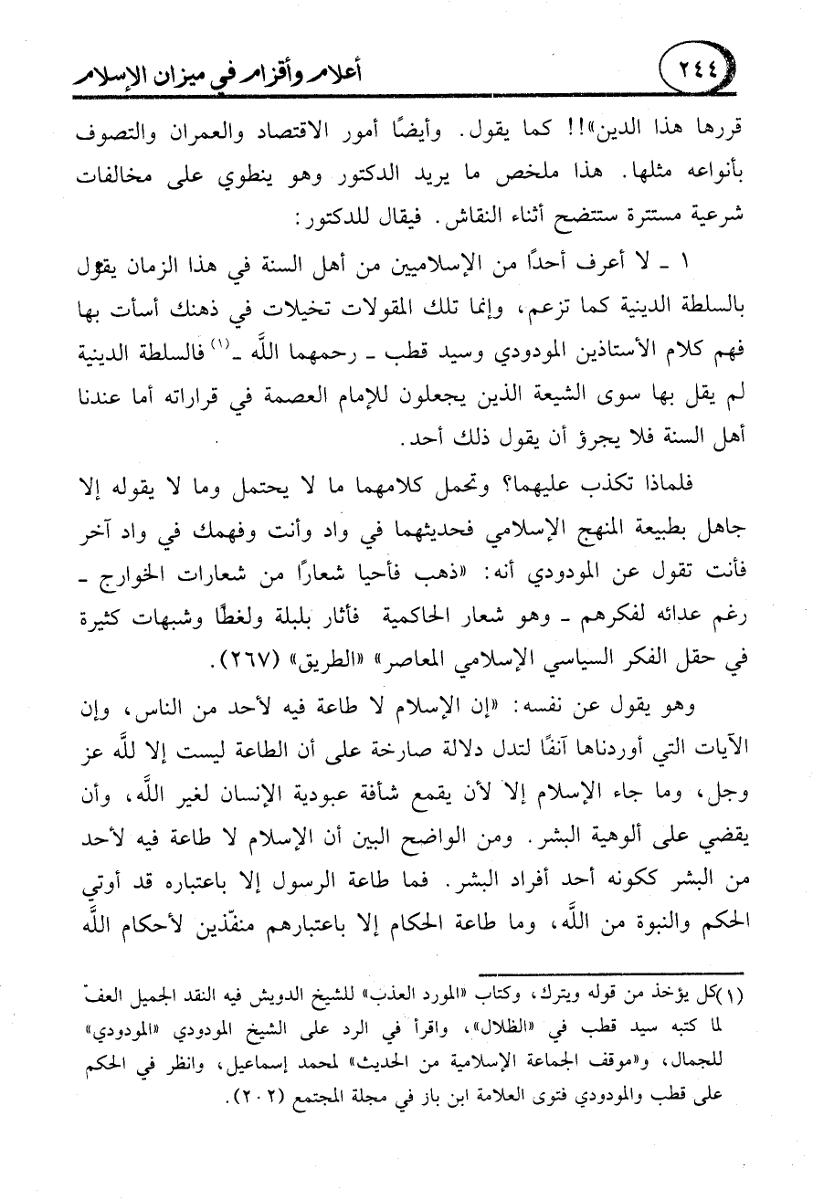 (1) كل يؤخذ من قوله ويترك، وكتاب "المورد العذب" للشيخ الدويش فيه النقد الجميل العفّ لما كتبه سيد قطب في "الظلال"، واقرأ في الرد على الشيخ المودودي "المودودي" للجمال، و"موقف الجماعة الإسلامية من الحديث" لمحمد إسماعيل، وانظر في الحكم على قطب والمودودي فتوى العلامة ابن باز في مجلة المجتمع (202).
