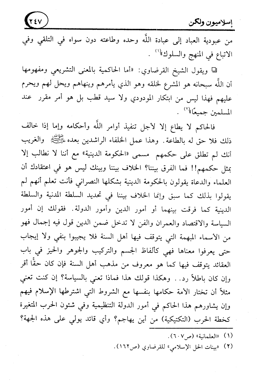 - ويقول الشيخ القرضاوي: "أما الحاكمية بالمعنى التشريعي ومفهومها أن الله سبحانه هو الشرع لخلقه وهو الذي يأمرهم وينهاهم ويحل لهم ويحرم عليهم فهذا ليس من ابتكار المودودي ولا سيد قطب بل هو أمر مقرر عند المسلمين جميعًا" (2).