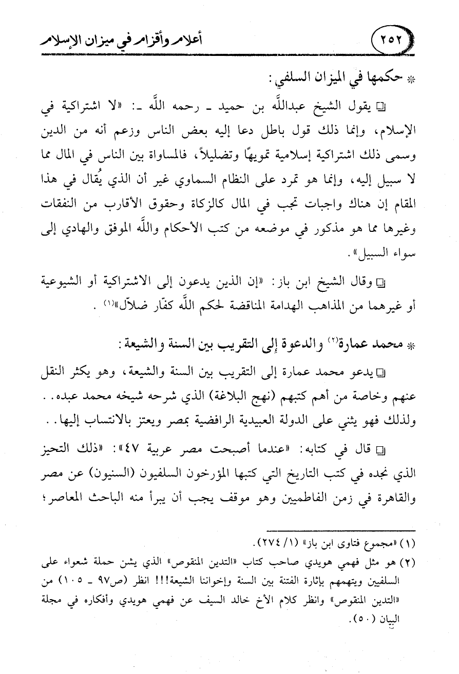 (2) هو مثل فهمي هويدي صاحب كتاب "التدين المنقوص" الذي يشن حملة شعواء على السلفيين ويتهمهم بإثارة الفتنة بين السنة وإخواننا الشيعة!!! انظر (ص 97 - 105) من "التدين المنقوص" وانظر كلام الأخ خالد السيف عن فهمي هويدي وأفكاره في مجلة الييان (50).