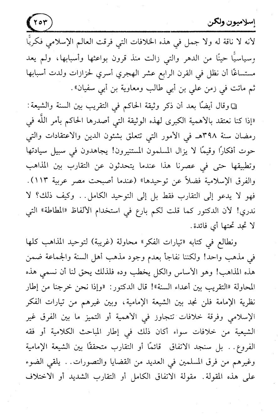 فهو لا يدعو إلى التقارب فقط بل إلى التوحيد الكامل .. وكيف ذلك؟ لا ندري! لأن الدكتور كما قلت لكم بارع في استخدام الألفاظ "المطاطة" التي لا تجد تحتها أي فائدة.
