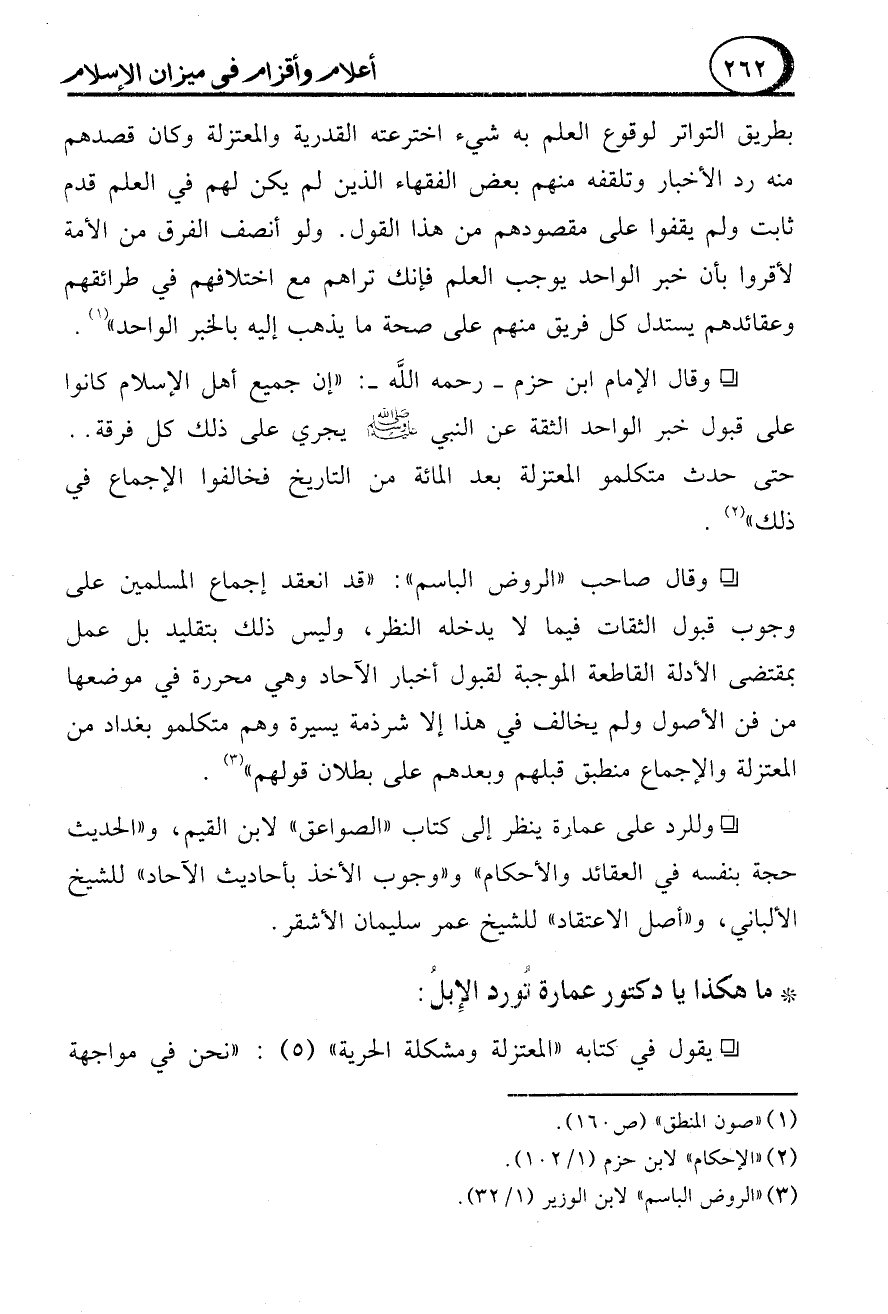 - وقال الإمام ابن حزم -رحمه الله-: "إن جميع أهل الإسلام كانوا على قبول خبر الواحد الثقة عن النبي - صلى الله عليه وسلم - يجري على ذلك كل فرقة .. حتى حدث متكلمو المعتزلة بعد المائة من التاريخ فخالفوا الإجماع في ذلك" (2).