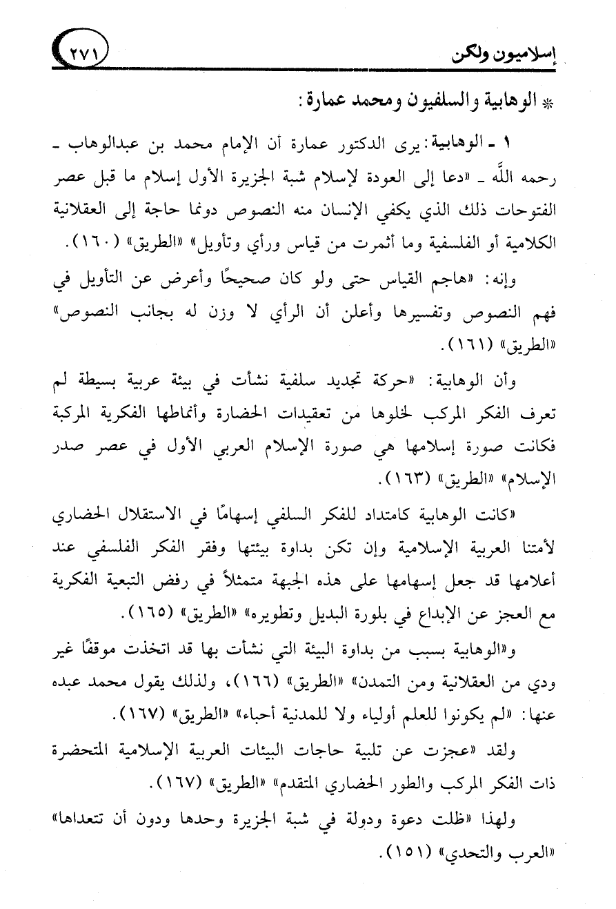 1 - الوهابية: يرى الدكتور عمارة أن الإمام محمد بن عبد الوهاب -رحمه الله- "دعا إلى العودة لإسلام شبة الجزيرة الأول إسلام ما قبل عصر الفتوحات ذلك الذي يكفي الإنسان منه النصوص دونما حاجة إلى العقلانية الكلامية أو الفلسفية وما أثمرت من قياس ورأي وتأويل" "الطريق" (160).