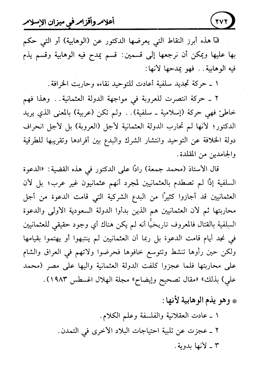- هذه أبرز النقاط التي يعرضها الدكتور عن (الوهابية) أو التي حكم بها عليها ويمكن أن نرجعها إلى قسمين: قسم يمدح فيه الوهابية وقسم يذم فيه الوهابية .. فهو يمدحها لأنها: