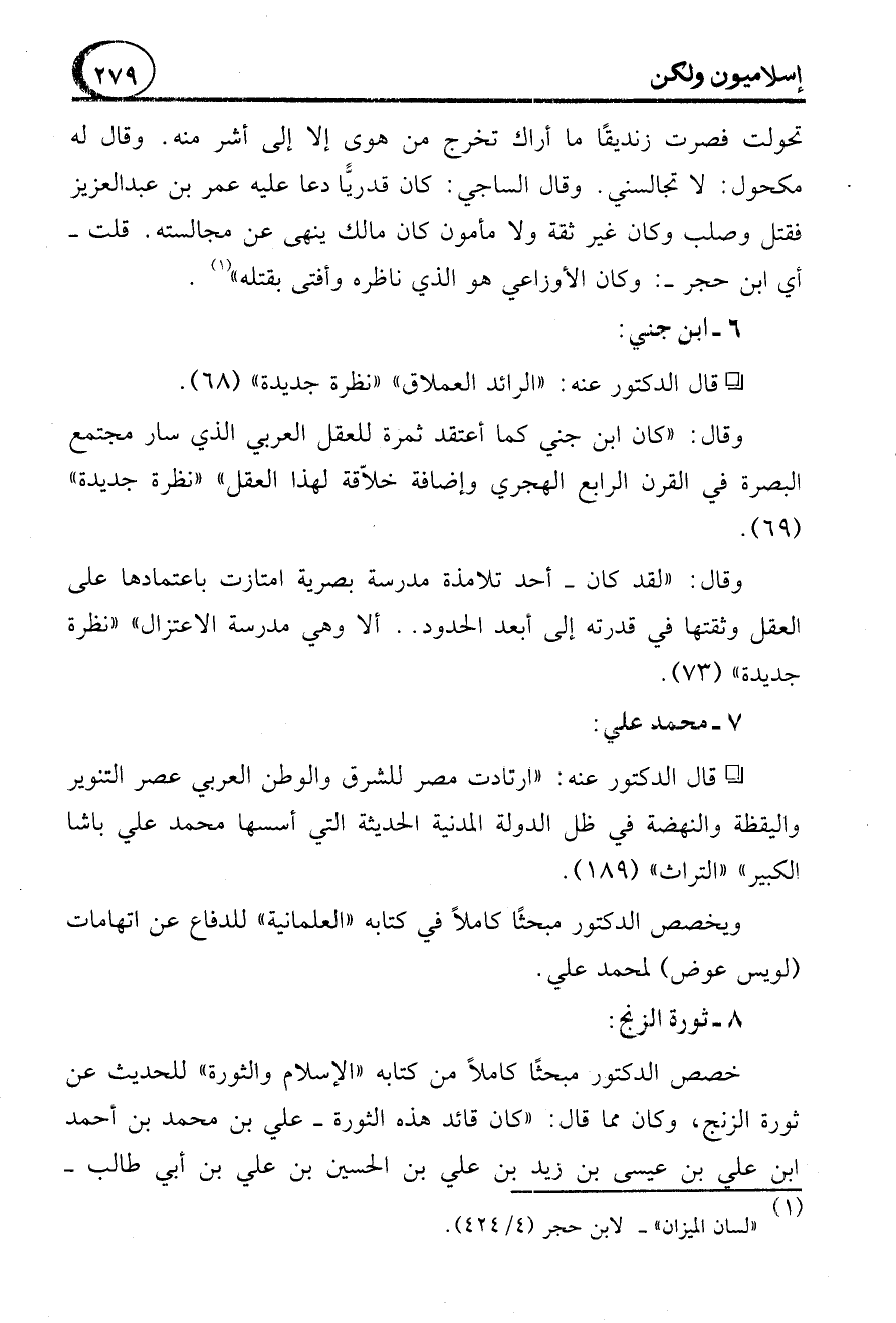 خصص الدكتور مبحثًا كاملاً من كتابه "الإسلام والثورة" للحديث عن ثورة الزنج، وكان مما قال: "كان قائد هذه الثورة -علي بن محمد بن أحمد ابن علي بن عيسى بن زيد بن علي بن الحسين بن علي بن أبي طالب-