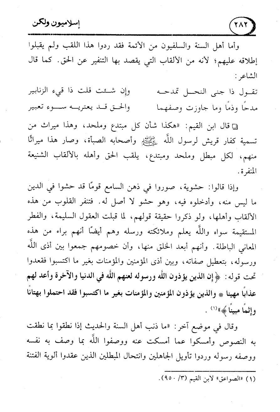 وإذا قالوا: حشوية، صوروا في ذهن السامع قومًا قد حشوا في الدين ما ليس منه، وأدخلوه فيه، وهو حشو لا أصل له. فتنفر القلوب من هذه الألقاب وأهلها، ولو ذكروا حقيقة قولهم، لما قبلت العقول السليمة، والفطر المستقيمة سواه والله يعلم وملائكته ورسله وهم أيضًا أنهم براء من هذه المعاني الباطلة. وأنهم أبعد الخلق منها، وأن خصومهم جمعوا بين أذى الله ورسوله، بتعطيل صفاته، وبين أذى المؤمنين والمؤمنات بغير ما اكتسبوا فقعدوا تحت قوله: {إِنَّ الَّذِينَ يُؤْذُونَ اللهَ وَرَسُولَهُ لَعَنَهُمُ اللهُ فِي الدُّنْيَا وَالْآَخِرَةِ وَأَعَدَّ لَهُمْ عَذَابًا مُهِينًا (57) وَالَّذِينَ يُؤْذُونَ الْمُؤْمِنِينَ وَالْمُؤْمِنَاتِ بِغَيْرِ مَا اكْتَسَبُوا فَقَدِ احْتَمَلُوا بُهْتَانًا وَإِثْمًا مُبِينًا} (1).