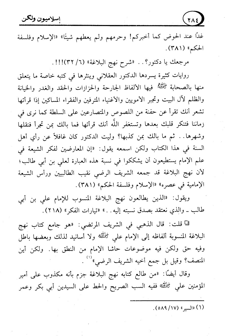 ويقول: "الذين يطالعون نهج البلاغة المنسوب للإمام علي بن أبي طالب - والذي نعتقد بصدق نسبته إليه .. " "تيارات الفكر" (218).