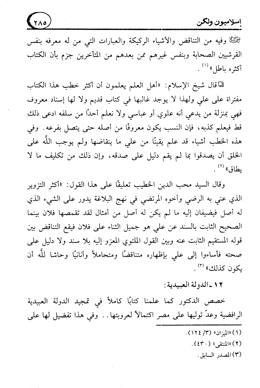 - رضي الله عنهما - وفيه من التناقض والأشياء الركيكة والعبارات التي من له معرفه بنفس القرشيين الصحابة وبنفس غيرهم ممن بعدهم من المتأخرين جزم بأن الكتاب أكثره باطل" (1).