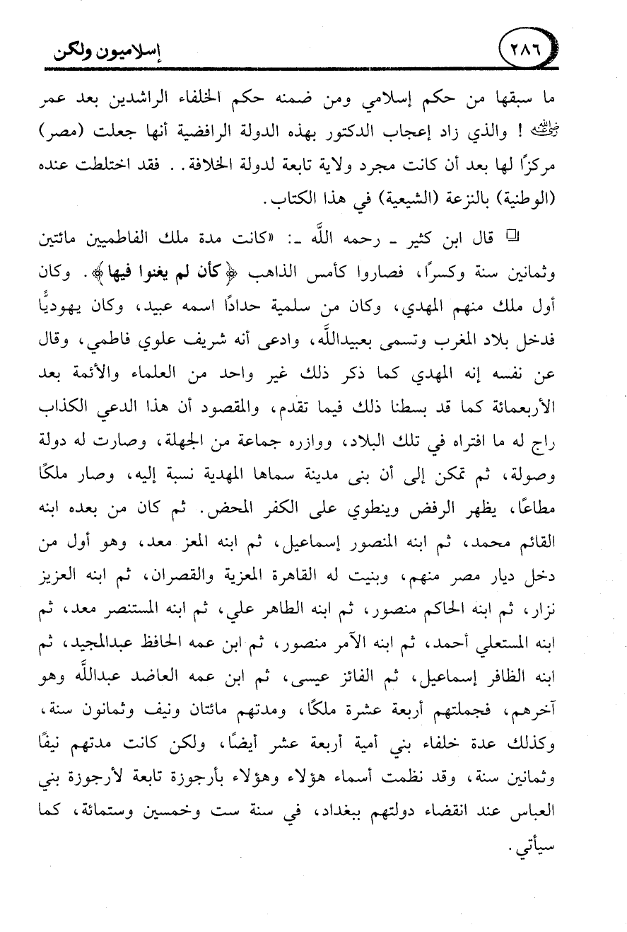 ما سبقها من حكم إسلامي ومن ضمنه حكما الخلفاء الراشدين بعد عمر - رضي الله عنه -! والذي زاد إعجاب الدكتور بهذه الدولة الرافضية أنها جعلت (مصر) مركزًا لها بعد أن كانت مجرد ولاية تابعة لدولة الخلافة .. فقد اختلطت عنده (الوطنية) بالنزعة (الشيعية) في هذا الكتاب.
