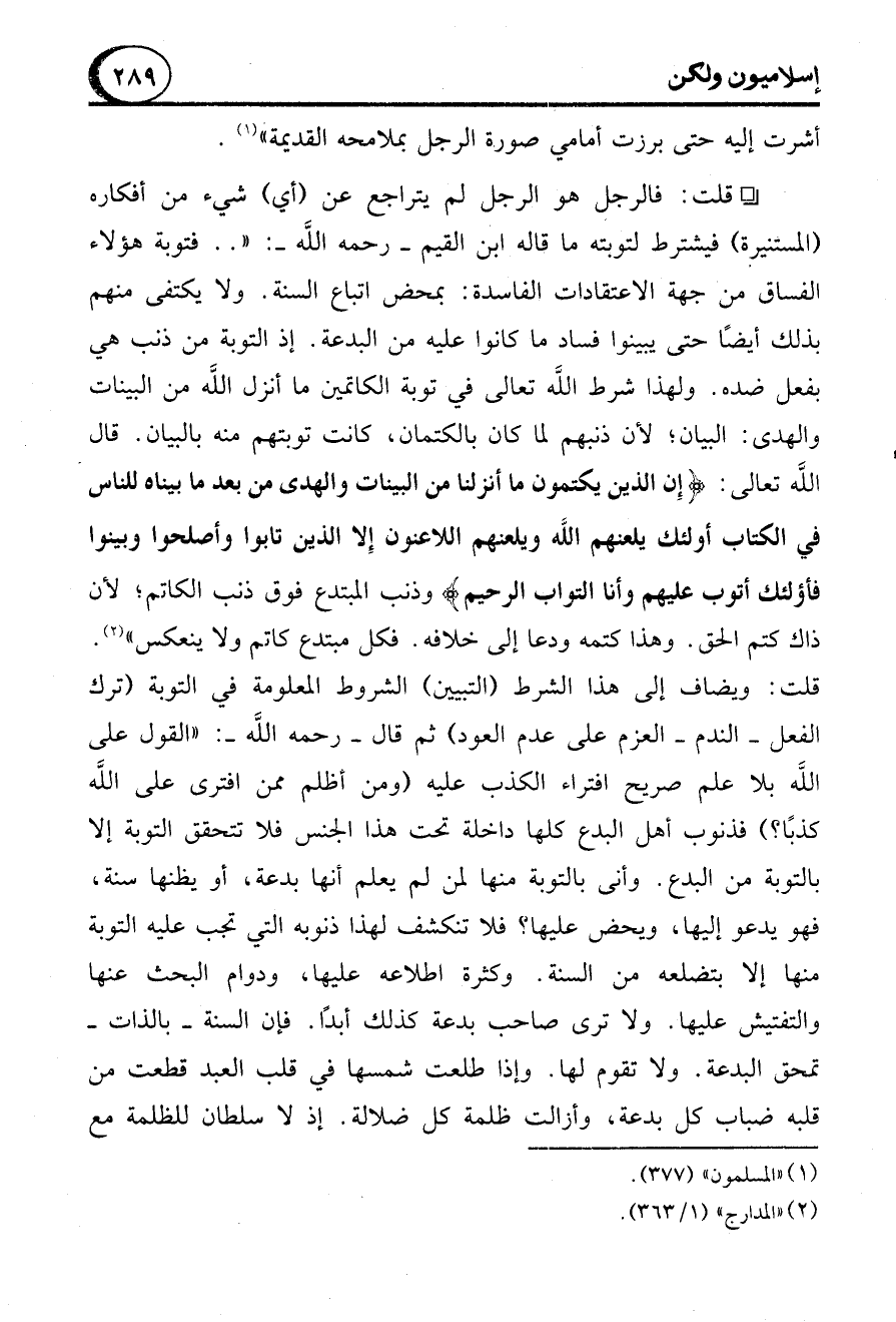 - قلت: فالرجل هو الرجل لم يتراجع عن (أي) شيء من أفكاره (المستنيرة) فيشترط لتوبته ما قاله ابن القيم -رحمه الله-: " .. فتوبة هؤلاء الفساق من جهة الاعتقادات الفاسدة: بمحض اتباع السنة. ولا يكتفى منهم بذلك أيضًا حتى يبينوا فساد ما كانوا عليه من البدعة. إذ التوبة من ذنب هي بفعل ضده. ولهذا شرط الله تعالى في توبة الكاتمين ما أنزل الله من البينات والهدى: البيان؛ لأن ذنبهم لما كان بالكتمان، كانت توبتهم منه بالبيان. قال الله تعالى: {إِنَّ الَّذِينَ يَكْتُمُونَ مَا أَنْزَلْنَا مِنَ الْبَيِّنَاتِ وَالْهُدَى مِنْ بَعْدِ مَا بَيَّنَّاهُ لِلنَّاسِ فِي الْكِتَابِ أُولَئِكَ يَلْعَنُهُمُ اللهُ وَيَلْعَنُهُمُ اللَّاعِنُونَ (159) إِلَّا الَّذِينَ تَابُوا وَأَصْلَحُوا وَبَيَّنُوا فَأُولَئِكَ أَتُوبُ عَلَيْهِمْ وَأَنَا التَّوَّابُ الرَّحِيمُ} وذنب المبتدع فوق ذنب الكاتم؛ لأن ذاك كتم الحق. وهذا كتمه ودعا إلى خلافه. فكل مبتدع كاتم ولا ينعكس" (2).