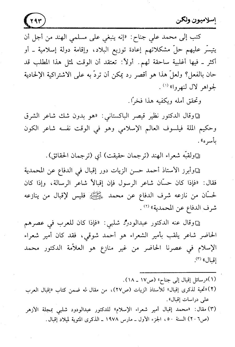 (3) مقال: "محمد إقبال أمير شعراء الإسلام" للدكتور عبد الودود شلبي بمجلة الأزهر (ص 206) السنة 50، الجزء الأول - مارس 1978 - الذكرى المئوية لميلاد إقبال.