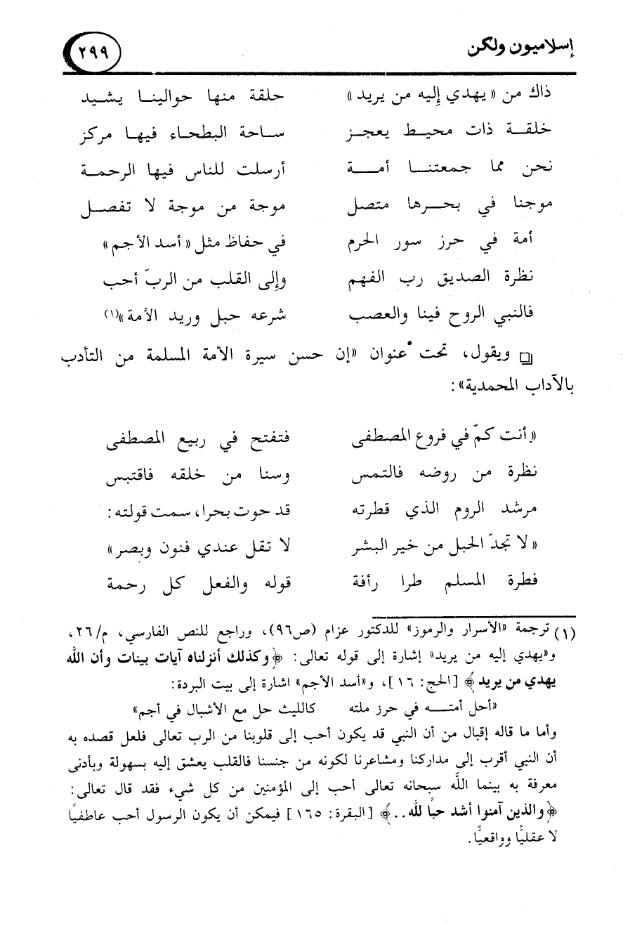 (1) ترجمة "الأسرار والرموز" للدكتور عزام (ص 96)، وراجع للنص الفارسي، م/26، و"يهدي إليه من يريد" إشارة الى قوله تعالى: {وَكَذَلِكَ أَنْزَلْنَاهُ آَيَاتٍ بَيِّنَاتٍ وَأَنَّ اللهَ يَهْدِي مَنْ يُرِيدُ} [الحج: 16]، و"أسد الأجم" إشارة إلى بيت البردة: