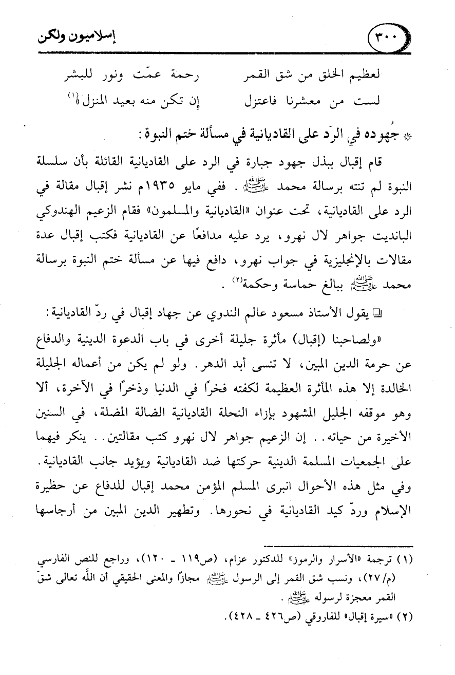 "ولصاحبنا (إقبال) مأثرة جليلة أخرى في باب الدعوة الدينية والدفاع عن حرمة الدين المبين، لا تنسى أبد الدهر. ولو لم يكن من أعماله الجليلة الخالدة إلا هذه المأثرة العظيمة لكفته فخرًا في الدنيا وذخرًا في الآخرة، ألا وهو موقفه الجليل المشهود بإزاء النحلة القاديانية الضالة المضلة، في السنين الأخيرة من حياته .. إن الزعيم جواهر لال نهرو كتب مقالتين .. ينكر فيهما على الجمعيات المسلمة الدينية حركتها ضد القاديانية ويؤيد جانب القاديانية.