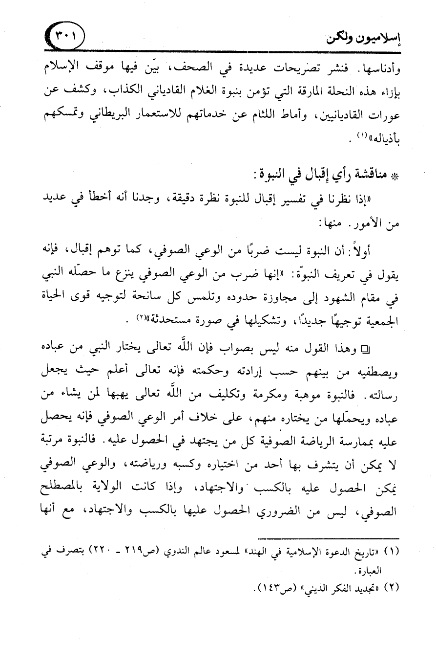 أولاً: أن النبوة ليست ضربًا من الوعي الصوفي، كما توهم إقبال، فإنه يقول في تعريف النبوّة: "إنها ضرب من الوعي الصوفي ينزع ما حصّله النبي في مقام الشهود إلى مجاوزة حدوده وتلمس كل سانحة لتوجيه قوى الحياة الجمعية توجيهًا جديدًا، وتشكيلها في صورة مستحدثة" (2).