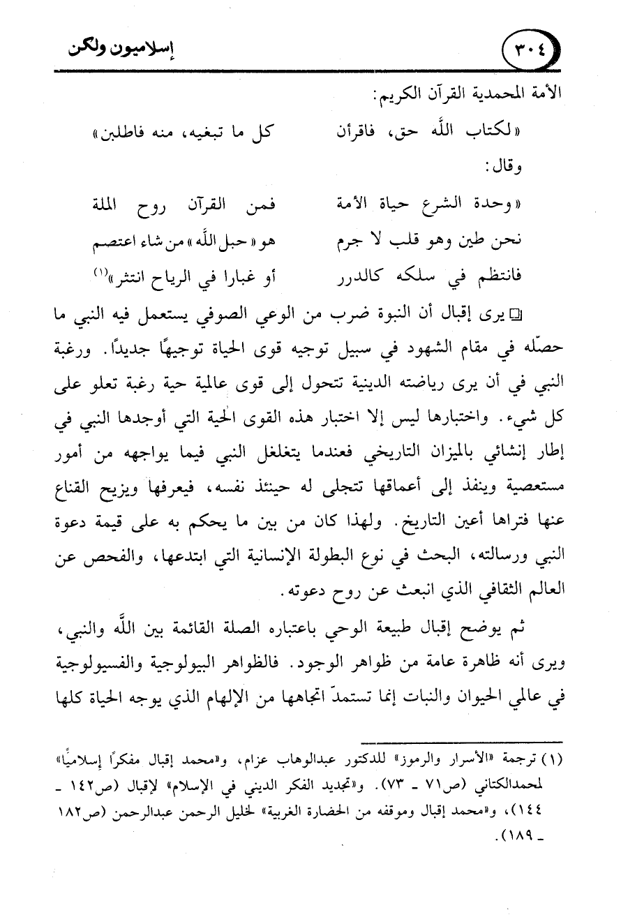 لمحمد الكتاني (ص 71 - 73). و"تجديد الفكر الديني في الإسلام" لإقبال (ص 142 - 144)، و"محمد إقبال وموقفه من الحضارة الغربية" لخليل الرحمن عبد الرحمن (ص 182 - 189).