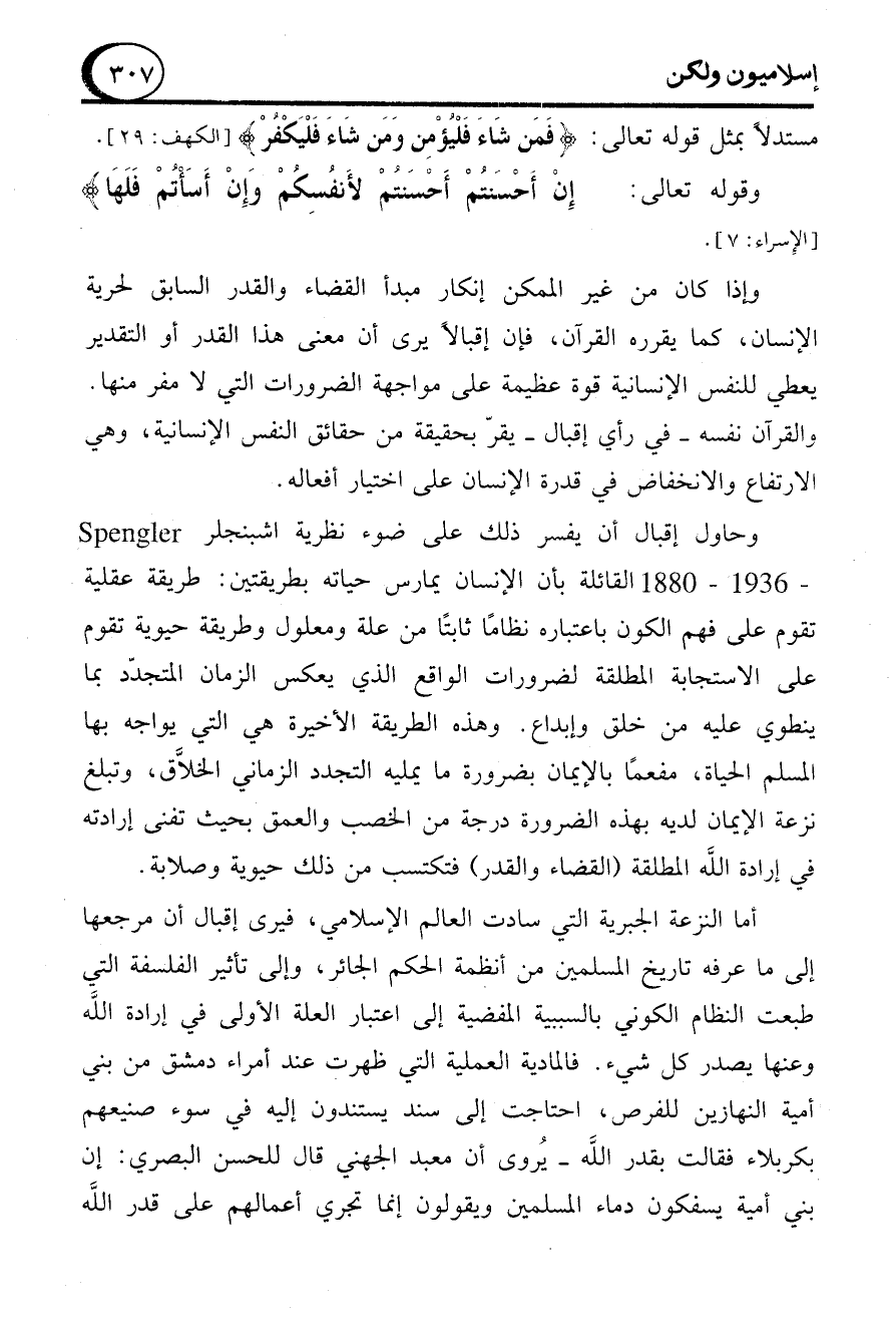 وحاول إقبال أن يفسر ذلك على ضوء نظرية اشبنجلر Spengler-1880 - 1936 القائلة بأن الإنسان يمارس حياته بطريقتين: طريقة عقلية تقوم على فهم الكون باعتباره نظامًا ثابتًا من علة ومعلول وطريقة حيوية تقوم على الاستجابة المطلقة لضرورات الواقع الذي يعكس الزمان المتجدّد بما ينطوي عليه من خلق وإبداع. وهذه الطريقة الأخيرة هي التي يواجه بها المسلم الحياة، مفعمًا بالإيمان بضرورة ما يمليه التجدد الزماني الخلاَّق، وتبلغ نزعة الإيمان لديه بهذه الضرورة درجة من الخصب والعمق بحيث تفنى إرادته في إرادة الله المطلقة (القضاء والقدر) فتكتسب من ذلك حيوية وصلابة.