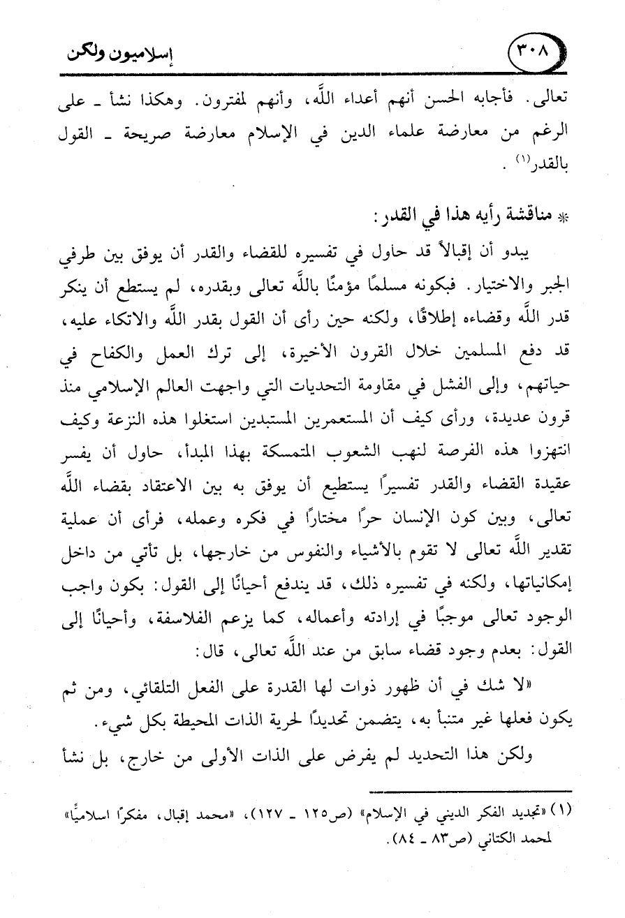 (1) "تجديد الفكر الديني في الإسلام" (ص 125 - 127)، "محمد إقبال، مفكرًا اسلاميًّا" لمحمد الكتاني (ص 83 - 84).