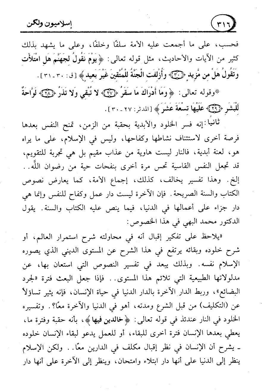 ثانيًا: إنه فسر الخلود والأبدية بحقبة من الزمن، تمنح النفس بعدها فرصة أخرى لاستئناف نشاطها وكفاحها، وليس في الإسلام، على ما يراه هو، لعنة أبدية، فالنار ليست هاوية من عذاب مقيم بل هي تجربة للتقويم، قد تجعل النفس القاسية تحس مرة أخرى بنفحات حية من رضوان الله .. إلخ. وهذا تفسير يخالف، كذلك، إجماع الأمة، كما يعارض نصوص الكتاب والسنة الصريحة. فإن الآخرة ليست دار عمل وكفاح للنفس وإنما هي دار جزاء على أعمالها في الدنيا، فيما ينص عليه الكتاب والسنة. يقول الدكتور محمد البهي في هذا الخصوص: