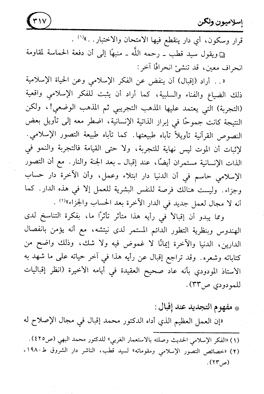 " .. أراد (إقبال) أن ينفض عن الفكر الإسلامي وعن الحياة الإسلامية ذلك الضياع والفناء والسلبية، كما أراد أن يثبت للفكر الإسلامي واقعية (التجربة) التي يعتمد عليها المذهب التجريبي ثم المذهب الوضعي!، ولكن النتيجة كانت جموحًا في إبراز الذاتية الإنسانية، اضطر معه إلى تأويل بعض النصوص القرآنية تأويلاً تأباه طبيعتها. كما تأباه طبيعة التصور الإسلامي.